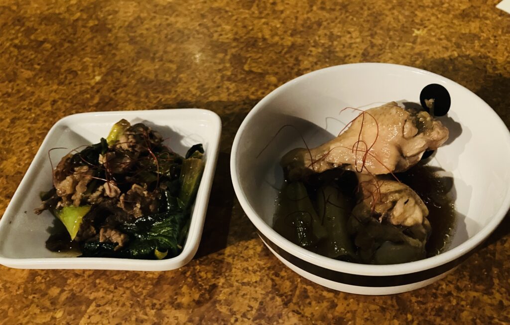 牛と小松菜の炒め煮は濃いめの味付けの中にほんのり酸味があって箸が進みますね。
